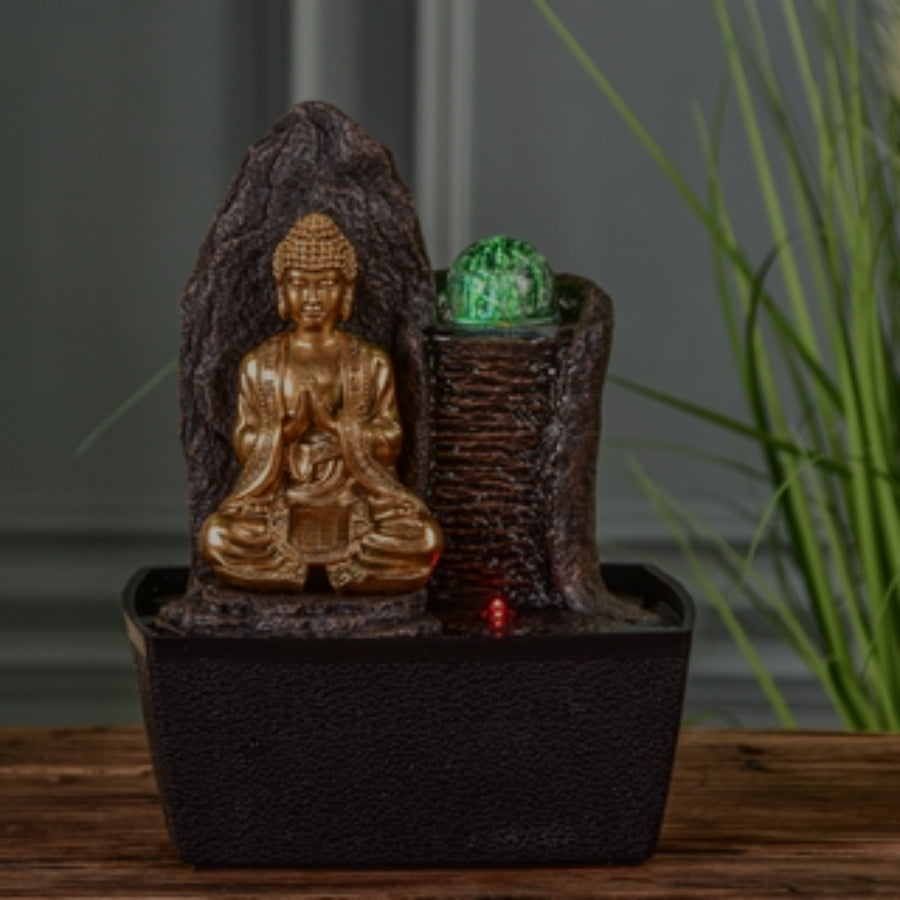 la fontaine Bhava, l'un des nouveaux modèles de cette année, réunit parfaitement le Feng-Shui à la décoration tendance en proposant les caractéristiques les plus appréciées par les clients: un écoulement en cascade sur plusieurs niveaux, une boule de verre entraînée en rotation par le passage de l'eau et une touche de spiritualité avec la belle statuette Bouddha fournie.